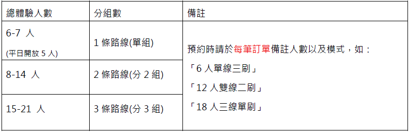 ● 若原預訂15人以上三線模式,預約人數臨時變動,請提前三天告知(不含出發日),現場臨時未達15人,仍將酌收最低三線遊戲費用,增加人數則現場以現金補差額。