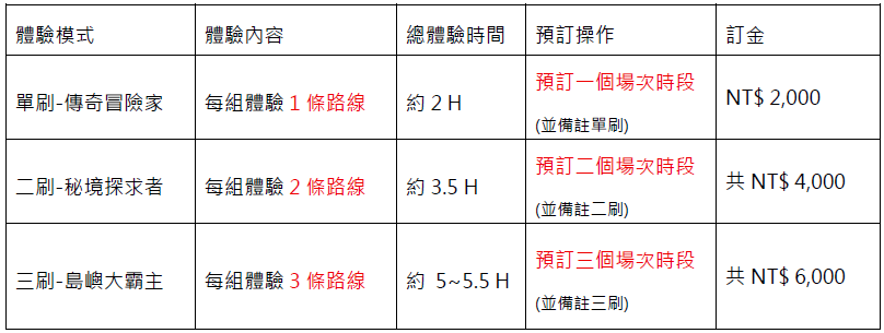 ※ 單場次玩家可官網直接預訂, 二、三刷若需調整時間請來電詢問!